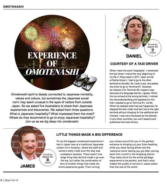 jStyle vol.1514 • 4th November 2015 EXPERIENCE OF OMOTENASHI 英語による日本のガイドブック。 「おもてなし」の体験についてオーストラリア人5人にインタビューを行いました。
