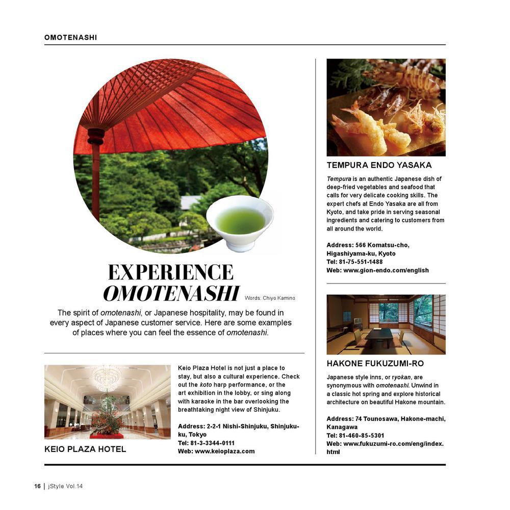 jStyle issue14 2016 • 4th November 2016 EXPERIENCE OMOTENASHI オーストラリア向けの日本の観光情報の紹介記事です。「おもてなし」が味わえる観光スポットやサービスについて英語で書きました。